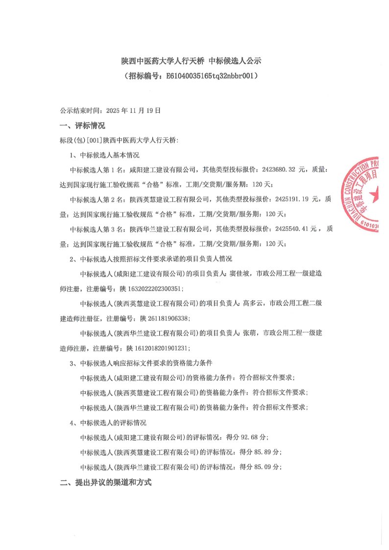 陕西中医药大学人行天桥中标候选人公示