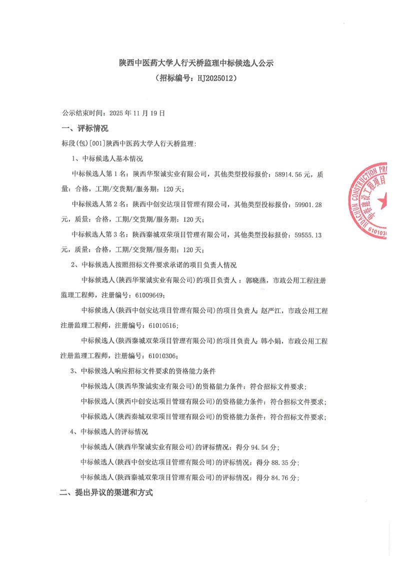 保标招标 > 人行天桥 > 中标信息 > 陕西中医药大学人行天桥监理中标候选人公示